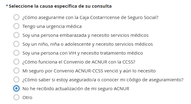 Si posterior al mes de diciembre de 2025 no ha recibido ningún mensaje de texto de parte de ACNUR, por favor reporte la situación a través de nuestro formulario de contacto (https://ayuda.acnur.org/costarica/contacto) seleccionando como tema de consulta “Salud” y causa específica de consulta “No he recibido actualización de mi seguro ACNUR”.