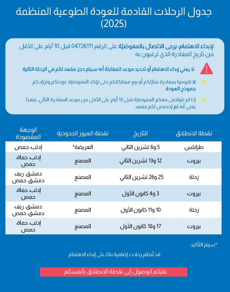 للسفر ضمن برنامج العودة الطوعية المنظّم من قبل المفوضيّة والمنظمة الدولية للهجرة: يُرجى الاطّلاع على جدول الرحلات القادمة: يقدم هذا البرنامج دعمًا بالنقل منظّم من قبل المفوضيّة والمنظمة الدولية للهجرة ومنحة نقدية لمرة .واحدة بقيمة 100 دولار أمريكي لكل فرد من أفراد العائلة العائين إلى سوريا