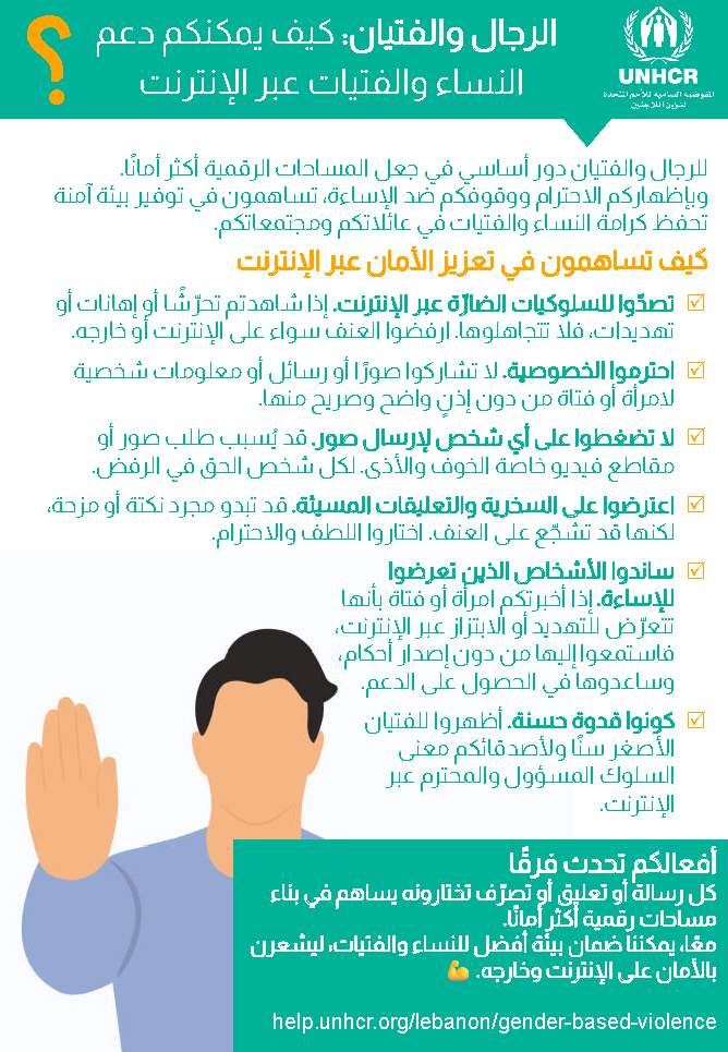 يجب أن تكون المساحات الإلكترونية أماكن للتعلّم والتواصل، لا أماكن للإيذاء. لكن العديد من النساء والفتيات يتعرّضن للتحرّش عبر الإنترنت، ولضغوطًا لإرسال صور، وللابتزاز، ولأشكال أخرى من العنف الرقمي. يلعب الرجال والفتيان دورًا مهمًا في منع حدوث ذلك.