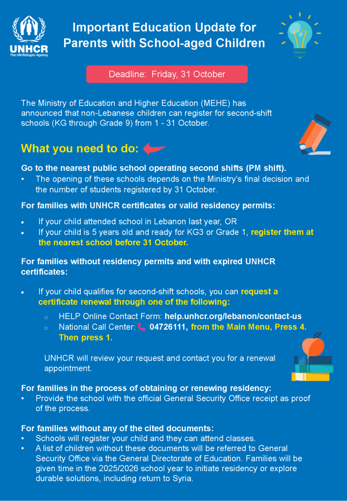 The opening of these schools depends on the Ministry’s final decision and the number of students registered by 31 October. - For families with UNHCR certificates or valid residency permits: