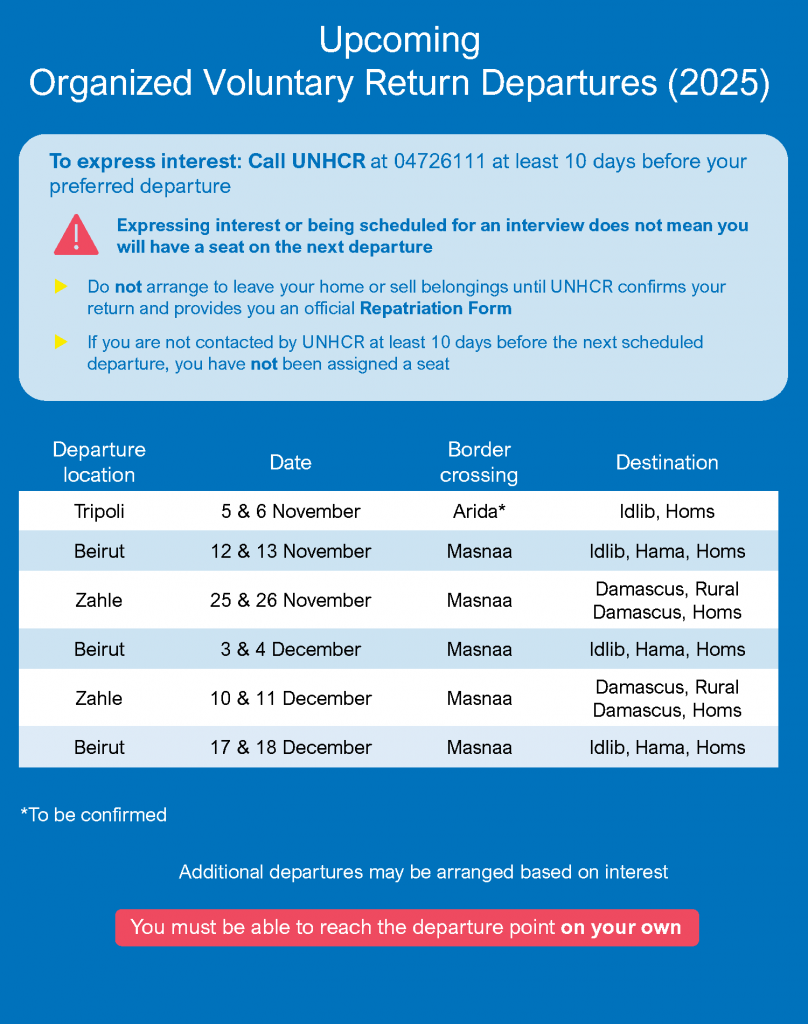 To travel on UNHCR and IOM’s Organized Voluntary Return Programme: see the schedule of upcoming departures. This programme offers transportation support arranged by UNHCR and IOM and a one-time return cash grant of USD 100 per family member returning to Syria.