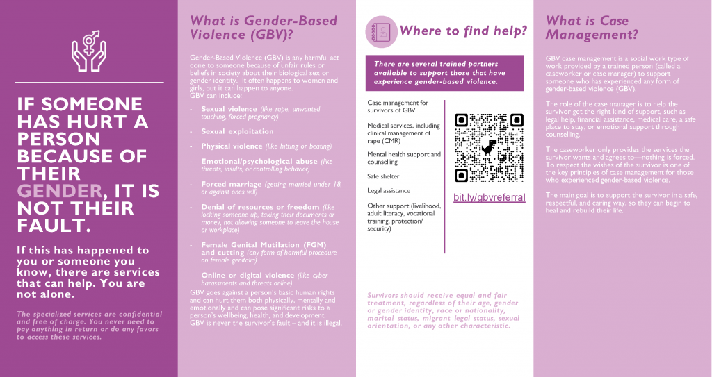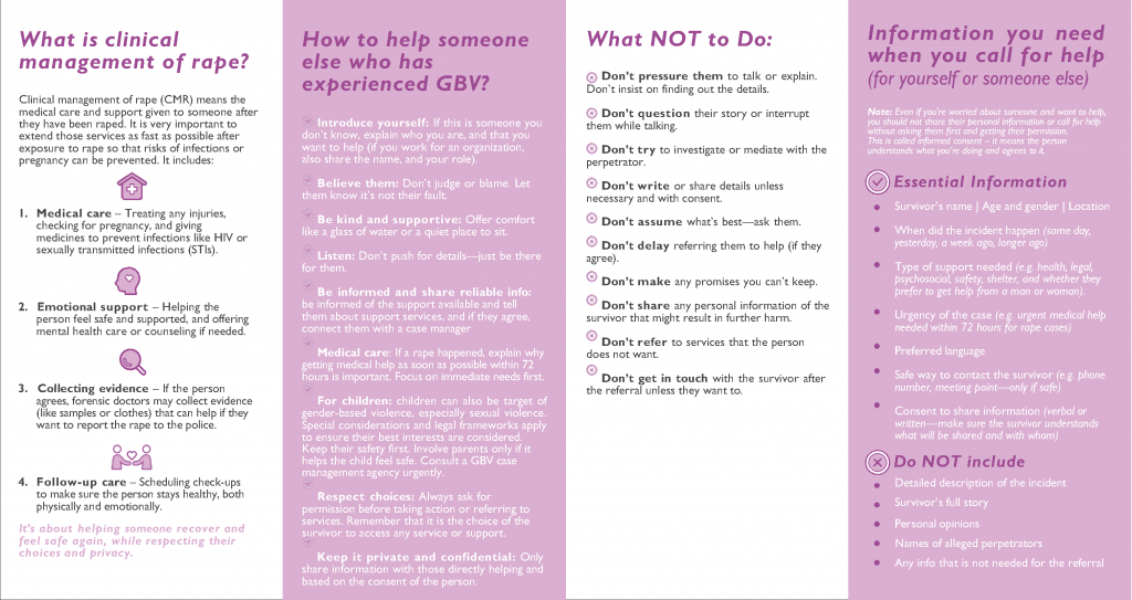 If you or someone you know is experiencing gender-based violence, remember it is your right to get help. UNHCR through its partners provides psychosocial support and counselling, safe shelters, legal support, and other assistance. To get help: