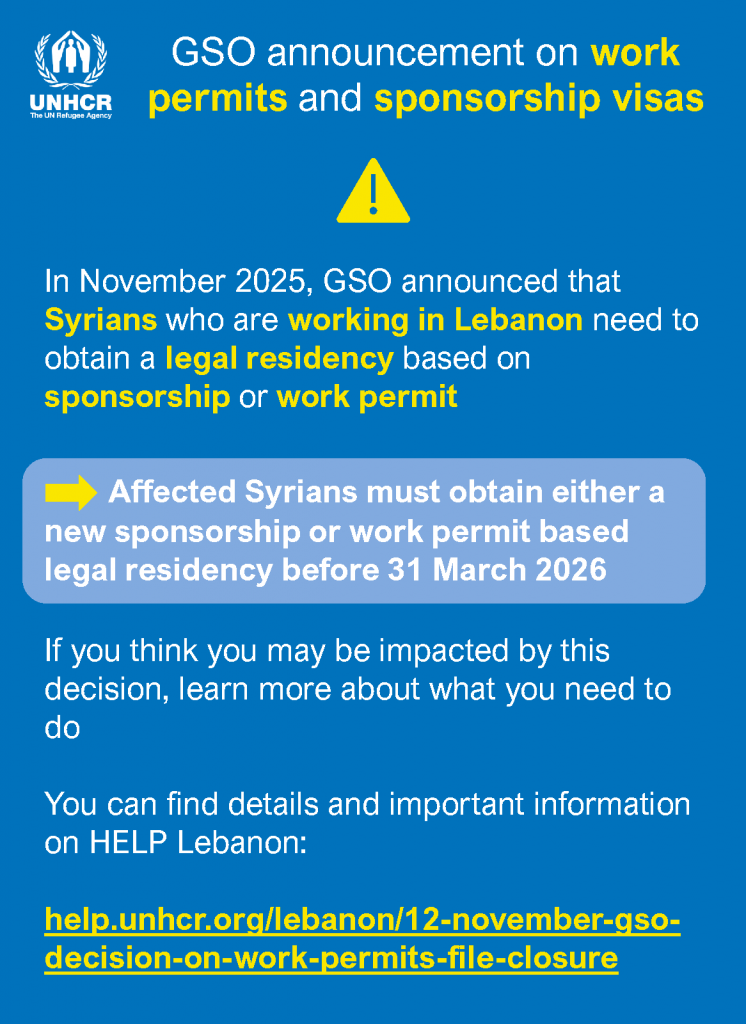 In November 2025, GSO announced that Syrians who are working in Lebanon need to obtain a legal residency based on sponsorship or work permit.