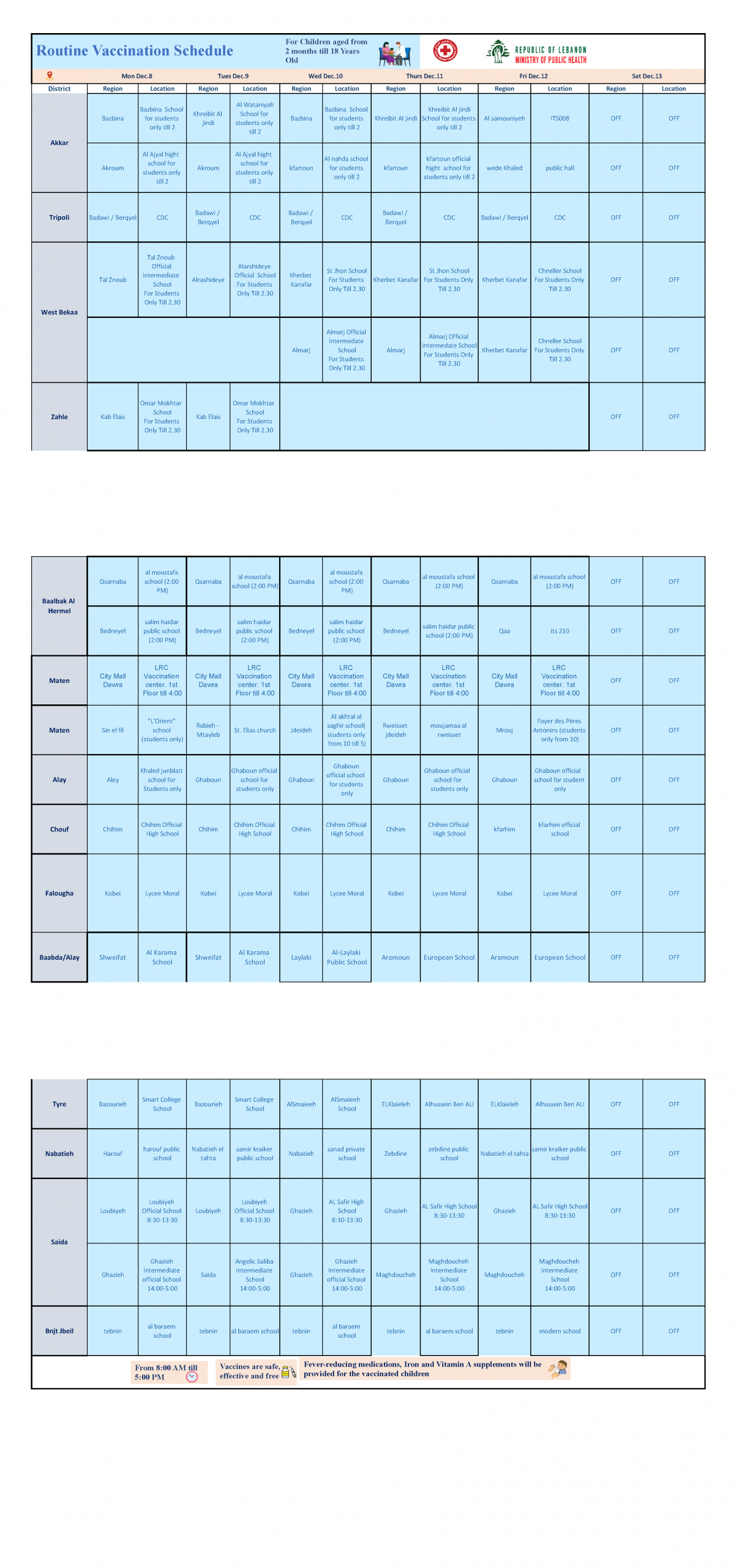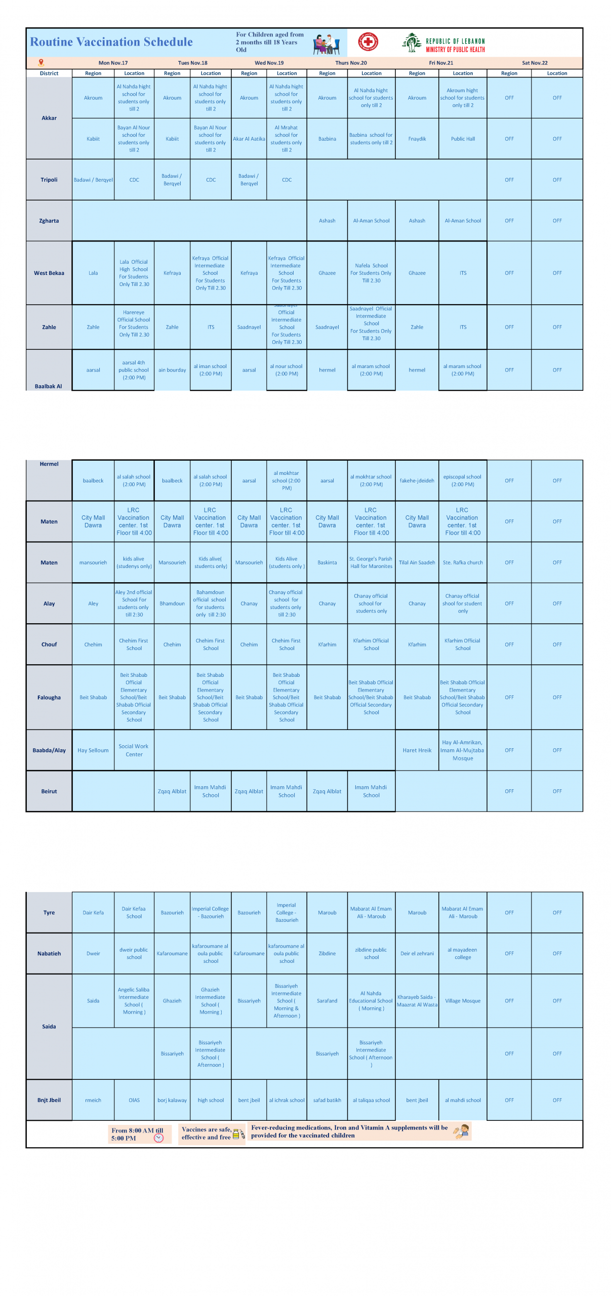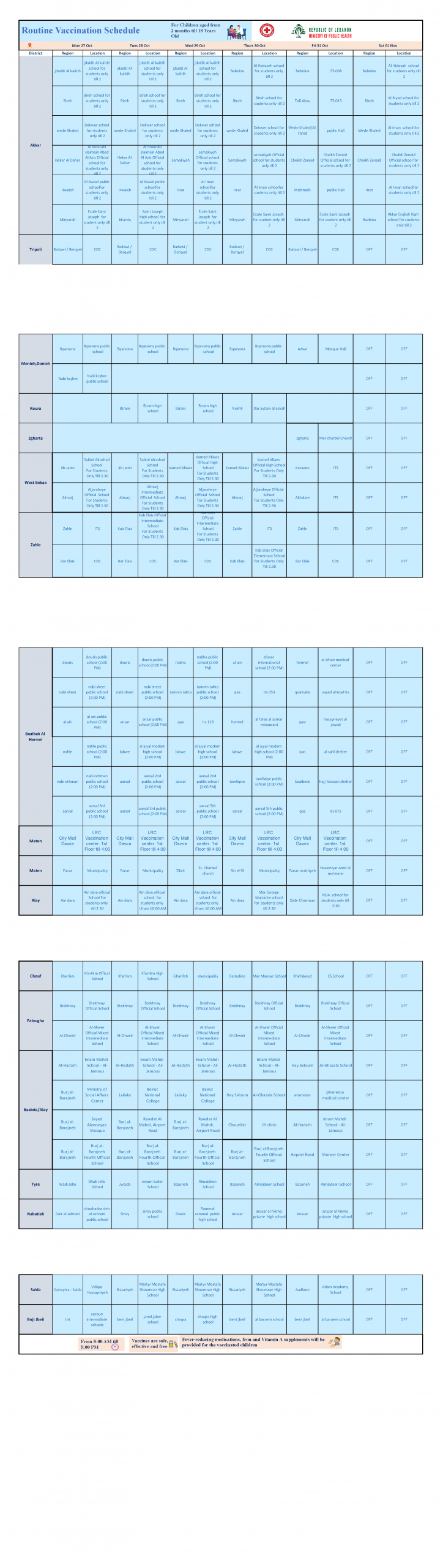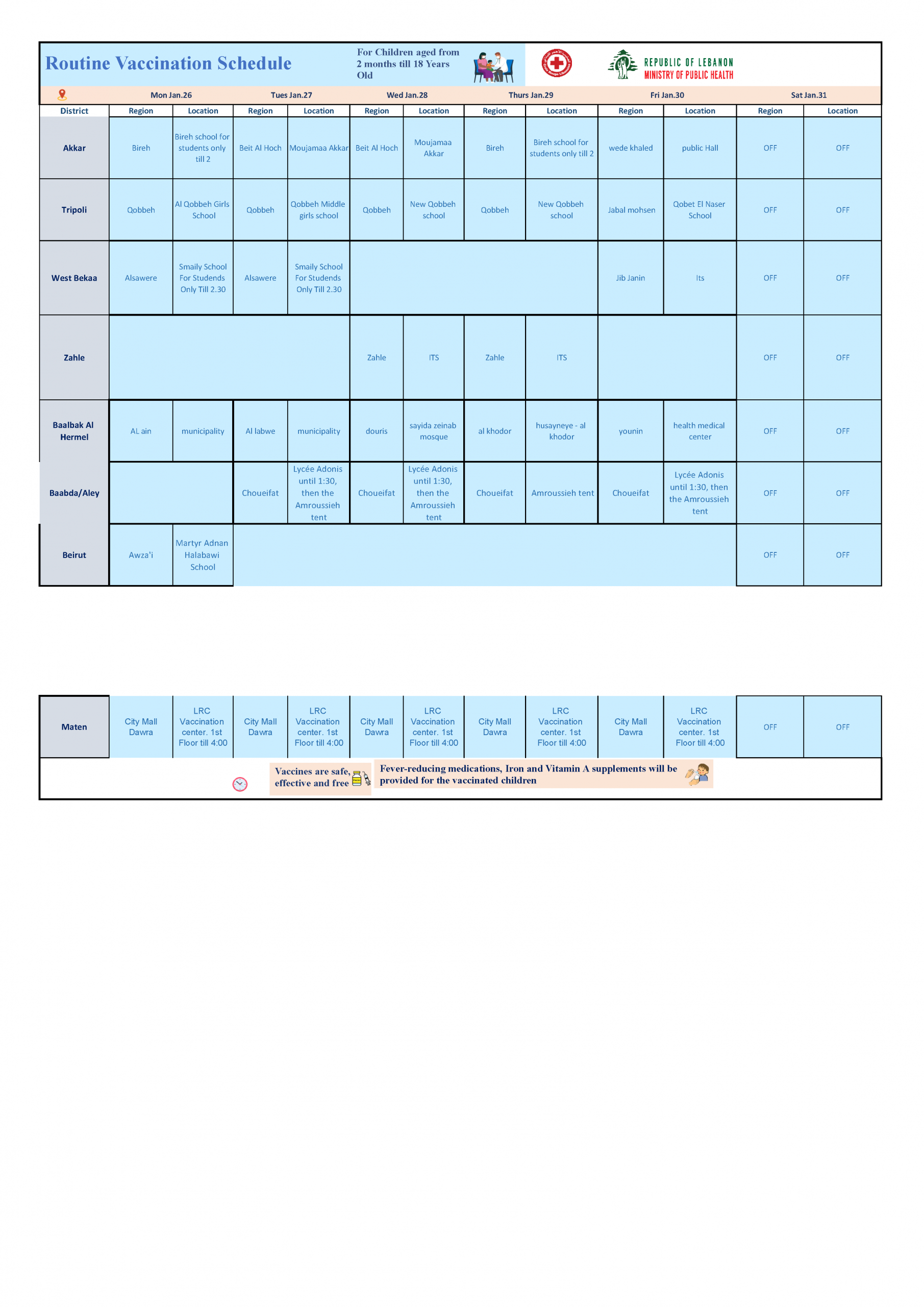 Please check the national Lebanese vaccination schedule (Question 6), and the mobile vaccination schedule here.