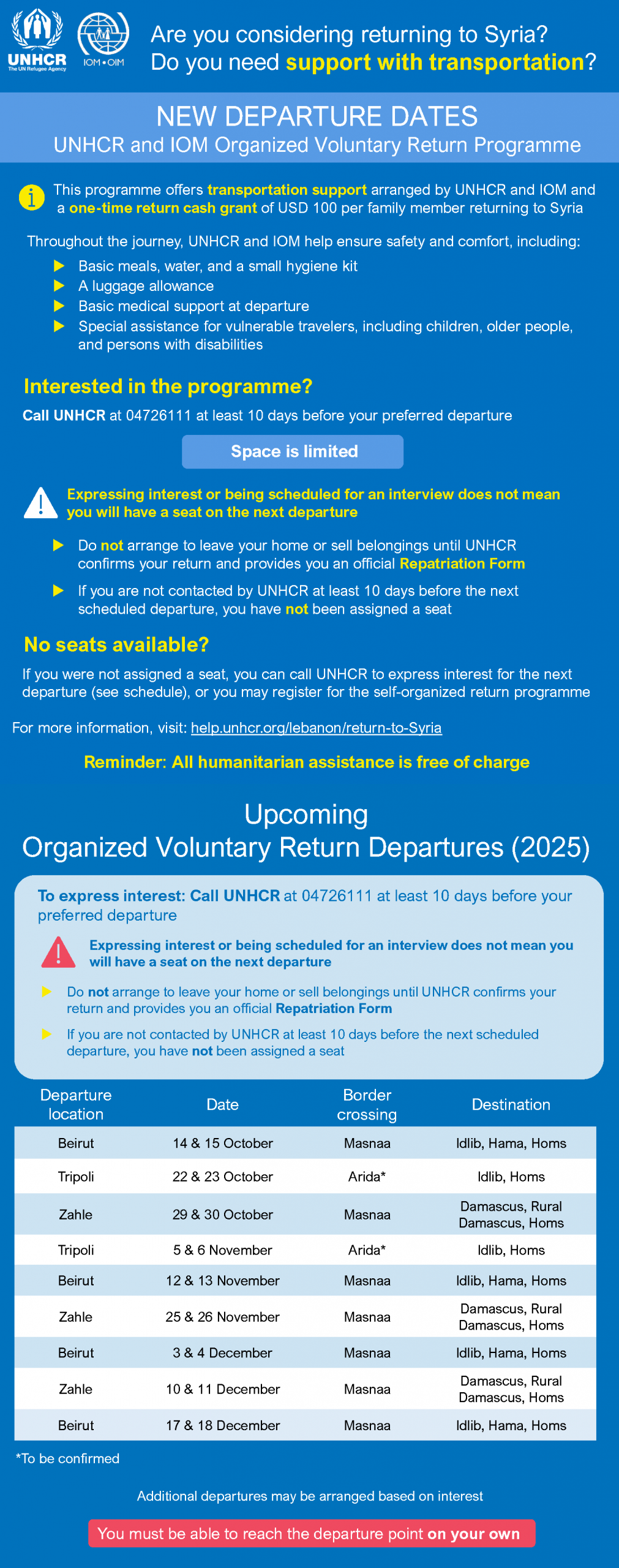 Organized Return: This programme requires preparation for departure. Departure does not happen immediately after you register your interest. It is not a daily or continuous programme — returns will happen on specific, scheduled dates only. Registering your interest in one of the scheduled organized returns does not mean you will automatically be selected for the program. Please do not initiate processes to leave Lebanon until UNHCR has contacted you and confirmed your participation in the organized return.