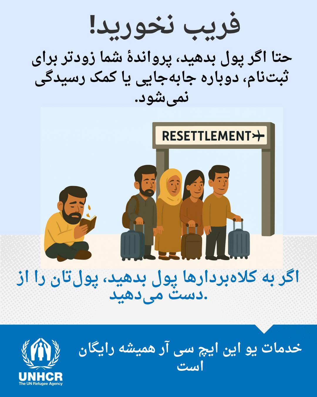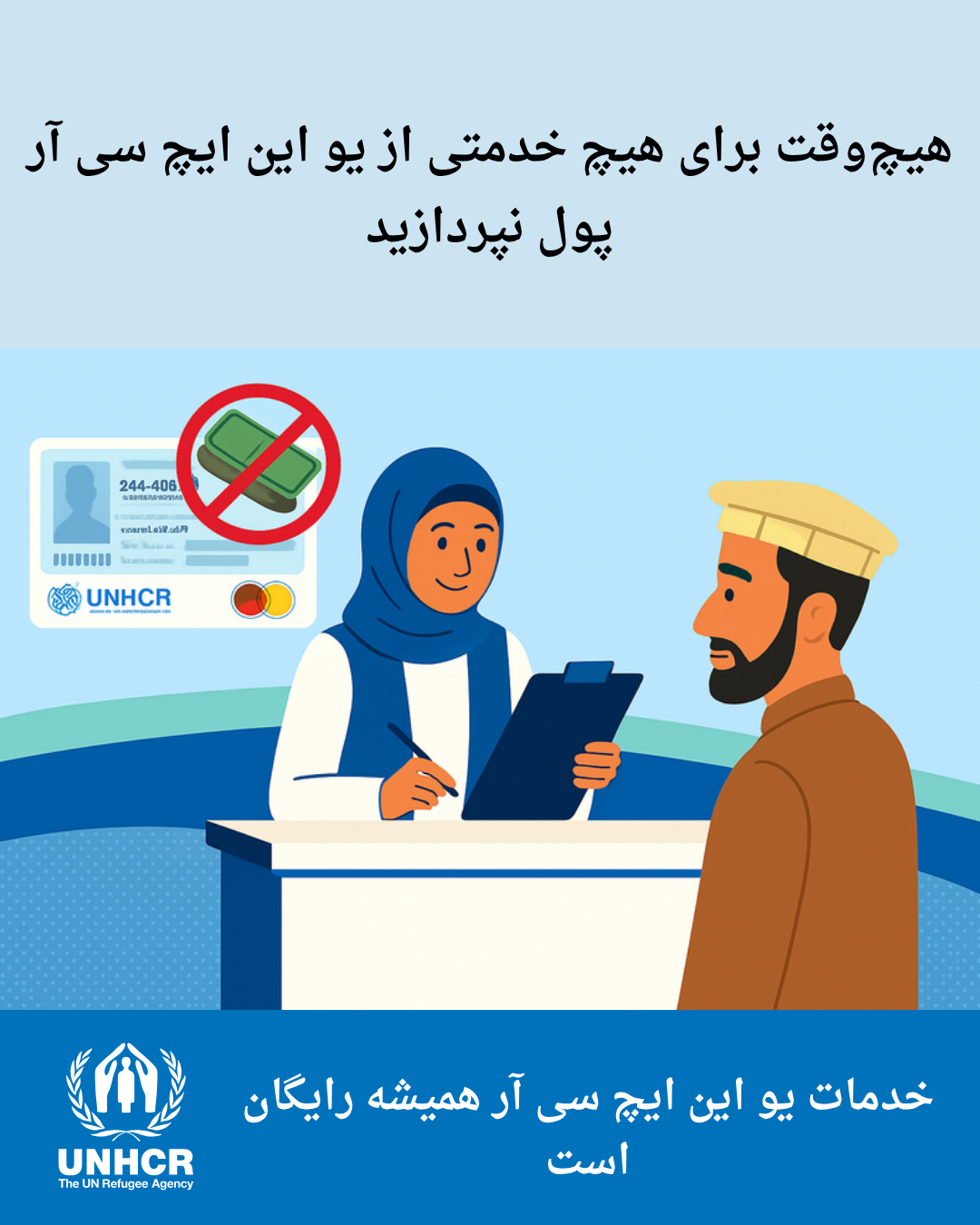 به یاد داشته باشید! تمام خدمات یو این اچ سی آر (UNHCR) رایگان است!