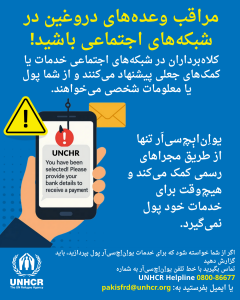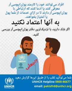 ۶. فعالیتهای مشکوک را گزارش دهید: اگر به کلاهبرداری مشکوک هستید یا پیشنهادهای فریبنده دریافت میکنید، لطفاً فوراً آن را از طریق شماره تماس رسمی یا ایمیلهای رسمی به دفتر محلی یو این اچ سی آر (UNHCR) گزارش دهید.