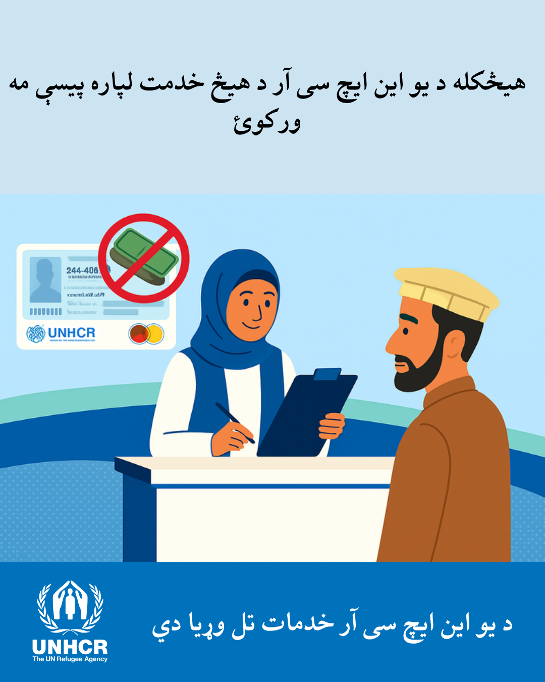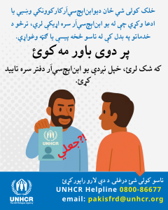هیڅوک یا هیڅ سازمان باور مه کوئ چې تاسو څخه د یو اېن ایچ سی آر یا د هغې د همکارانو د خدماتو لپاره پیسې غوښتنې کوي. که پیسې یا کوم بل ډول مرستې، چې په جنسي ډول وي، له تاسو څخه غوښتل کیږي، نو باید دا موضوع فوراً د یو اېن ایچ سی آر یا نږدې پولیسو ته راپور ورکړئ.
