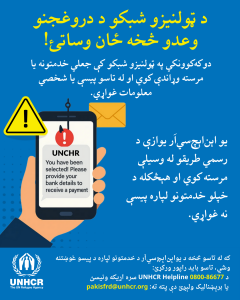 ٥. د شخصي شمېرو یا ایمیلونو په اړه محتاط اوسئ: که تاسو د WhatsApp په شخصي شمېره یا د شخصي ایمیل څخه (چې د رسمي سازمان ډومین نه وي) پیغام ترلاسه کړئ، نو دا فریب دی او باور وړ نه دی. هر وخت ډاډه اوسئ چې هر ډول اړیکه د تایید شوي او رسمي اړیکو څخه راغلې وي. د یو اېن ایچ سی آر ایمیل تل په ‘unhcr.org@’ پای ته رسيږي. د عامو پلیټ فارمونو لکه gmail.com، hotmail.com، yahoo.com، یا outlook.com څخه ایمیلونه رسمي نه دي او باید له پامه وغورځول شي. په دې پیغامونو ځواب مه ورکوئ او سمدلاسه یې د یو اېن ایچ سی آر ته راپور کړئ.