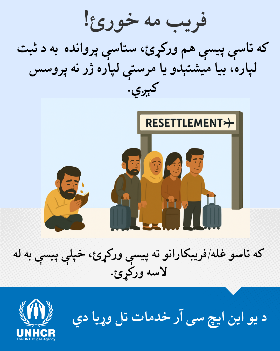 ٣. یواځې رسمي چینلونه وکاروئ: ستاسو د قضیې په اړه هر ډول رسمي اړیکه به د یو اېن ایچ سی آر، آی او اېم، یا د نورو باور وړ شریک کارونکو څخه راځي. د هر ډول مالوماتو د تایید لپاره، چې د نورو څخه ترلاسه شي، همیشه تاسو د سیمې د یو اېن ایچ سی آر دفتر سره اړیکه ونیسئ.