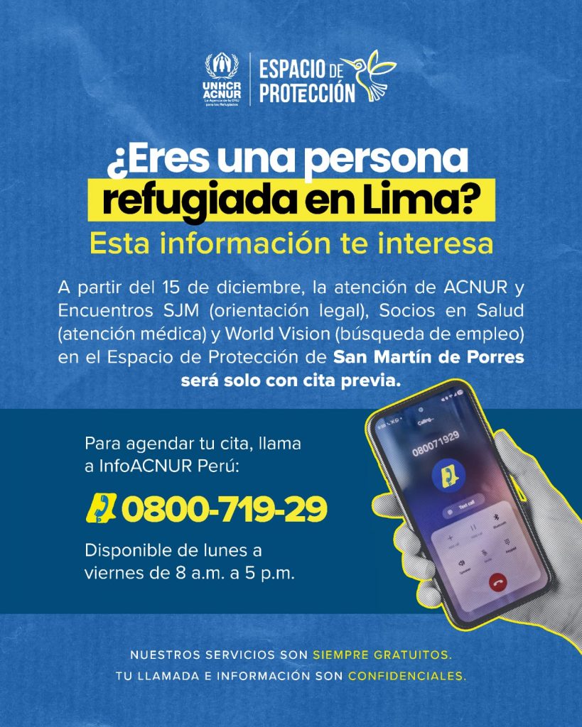 A partir del 15 de diciembre, la atención de ACNUR y Encuentros SJM (orientación legal), Socios en Salud (atención médica) y World Vision (búsqueda de empleo) en el Espacio de Protección de San Martin de Porres será solo con cita previa.