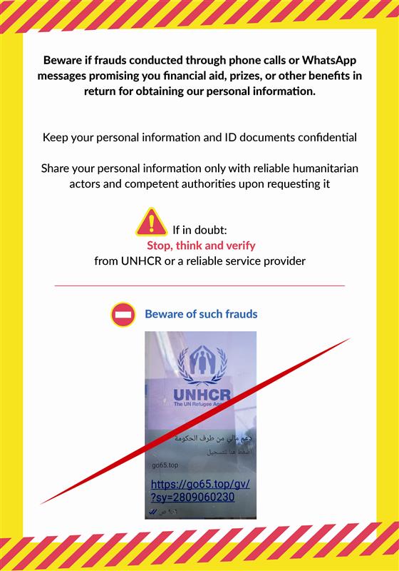 Never share your personal data or information related to UNHCR registration and bank account with anyone claiming to be offering assistance, resettlement or cash.