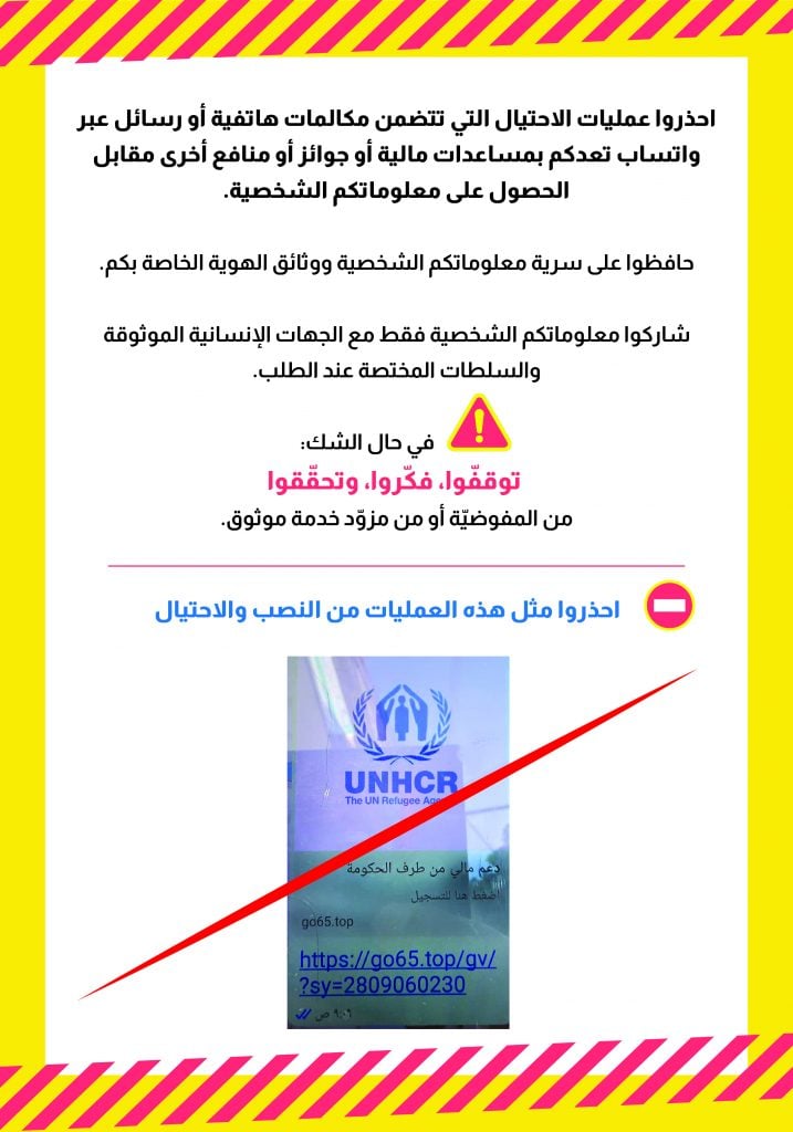 • لا تشارك بياناتك الشخصية أو معلوماتك الحساسة أو حسابك المصرفي مع أي شخص يدّعي أنه يقدم المساعدات أو يساعد في إعادة التوطين أو يقدم المال.